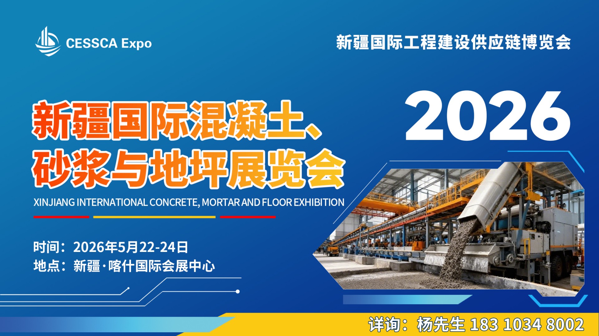 展会备注 2026新疆混凝土砂浆地坪展将于5 月22-24日新疆喀什国际会展中心举办,展示全产业链产品技术,含高端同期活动,立足新疆辐射中亚,详询18310348002。 |