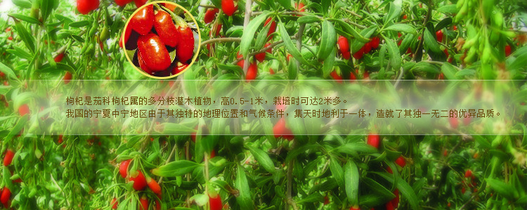 | 宁夏中宁县更是中国**的枸杞之乡,已经有600多年的种植历史。中宁地区土壤碱性重,昼夜温差大,这样的自然条件适合枸杞的生长,早在明朝,这里的枸杞**被列为贡品。 |