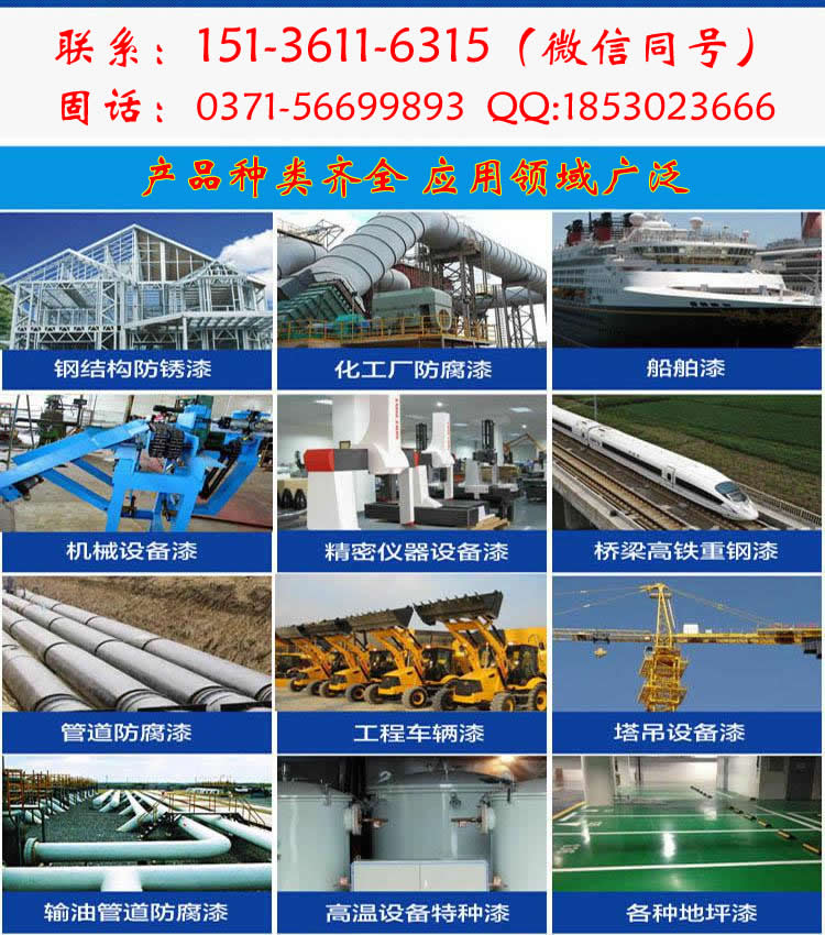 我公司六大产品分类:订购咨询:151-3611-6315(微^信^同号)(一)防腐防锈漆:环氧富锌底漆.环氧煤沥青漆.环氧呋喃防腐漆.环氧玻璃鳞片漆.环氧云铁中间漆.脂肪族聚氨酯面漆.环氧红丹防锈漆,酚醛防锈漆,灰铝粉石墨醇酸面漆,醇酸调和漆,冷镀锌漆,银粉漆,氯磺化聚乙烯漆,高氯化聚乙烯漆,氯化橡胶漆,氨基烘干磁漆,丙烯酸磁漆,聚氨酯磁漆,环氧磁漆,氟碳漆,丙烯酸机械漆,无机富锌底漆,丙烯酸聚氨酯漆,快干硝基漆,IPN8710防腐漆,环氧底漆,环氧树脂漆,环氧导静电漆,白环氧无毒防腐漆,环氧磷酸锌底漆,环氧锌黄底漆,凉凉胶隔热防腐漆等。(二)划线标志漆:丙烯酸马路划线漆,公路划线漆,道路划线漆,停车场停车位划线漆,航空标志漆等。(三)耐高温漆:有机硅耐高温漆(200--800度)(四)防火涂料:钢结构防火涂料(五)环氧地坪漆,聚氨酯地坪漆,环氧自流平漆(六)特种用途类油漆涂料:氰凝防水防腐涂料,无毒环氧内壁漆,管道内壁防腐漆等。