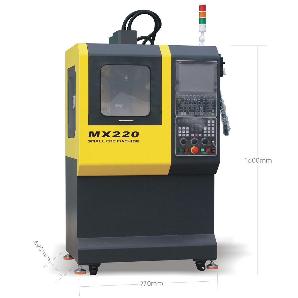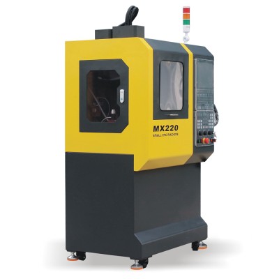 MX220桌面五轴联动数控机床是一款桌面式微型五轴联动数控机床,适用于小型精密五轴零件及各种各样的复杂零件加工;具有体积小、重量轻、搬运方便、操作灵活等优点;使用220伏电压,配置工业级五轴联动控制系统面板,支持RTCP刀尖跟随功能,10英寸彩色液晶竖屏,带5轴三档电子手脉;机床具有X、Y、Z三个直线轴和两个旋转轴(B轴+C轴)五个坐标轴,X、Y、Z直线轴采用直线导轨,BC两个旋转轴采用谐波减速机,保证高精度和高稳定性;具有一次装夹、任意曲面加工、复合工艺加工等优势、操作便利;具有性价比高、性能稳定、故障率低、维护成本低等优点;