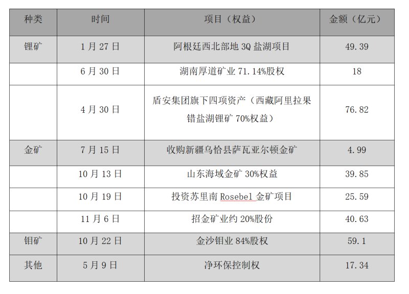 至此,紫金矿业今年以来收购金额合计高达331.71亿元。这些收购完成后,紫金矿业拥有的锂矿权益资源量已经超过1000万吨,仅次于赣锋和天齐锂业,在全球也可以排进前十位。而且,紫金矿业黄金资源总量将近3000吨。
