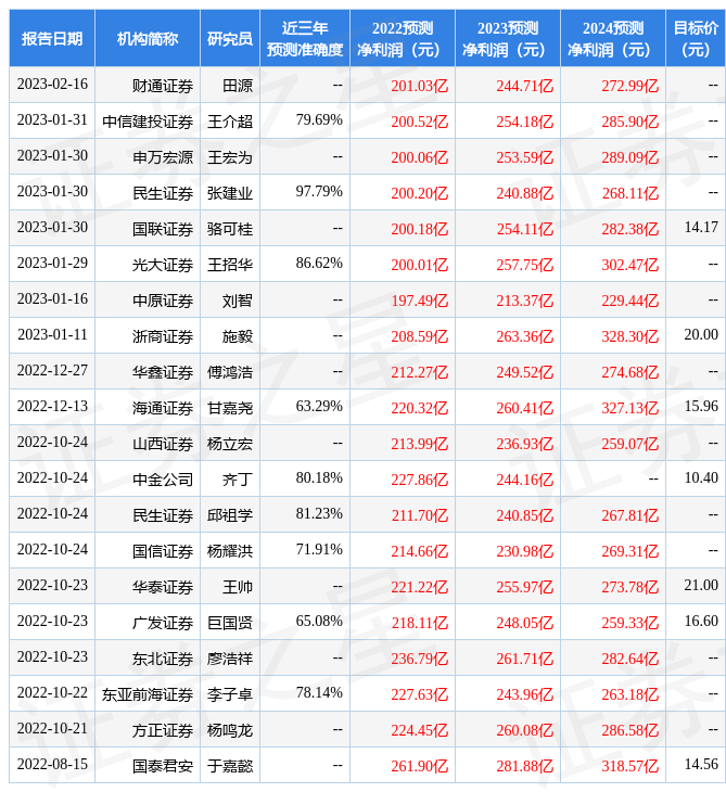 证券之星数据中心根据近三年发布的研报数据计算,民生证券张建业研究员团队对该股研究较为深入,近三年预测准确度均值高达97.79%,其预测2022年度归属净利润为盈利200.2亿,根据现价换算的预测PE为15.92。