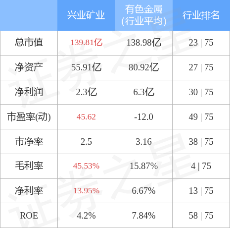 兴业矿业2022三季报显示,公司主营收入16.48亿元,同比上升3.02%;归母净利润2.3亿元,同比下降13.54%;扣非净利润2.44亿元,同比下降15.41%;其中2022年第三季度,公司单季度主营收入6.42亿元,同比上升43.22%;单季度归母净利润1.01亿元,同比上升117.19%;单季度扣非净利润1.1亿元,同比上升116.87%;负债率39.65%,投资收益-457.9万元,财务费用1.16亿元,毛利率45.52%。兴业矿业(000426)主营业务:有色金属及贵金属采选与冶炼。