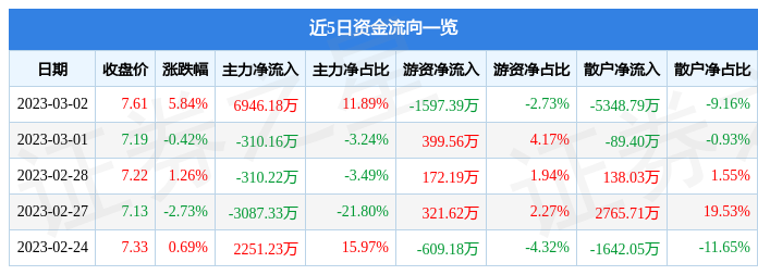 3月2日的资金流向数据方面,主力资金净流入6946.18万元,占总成交额11.89%,游资资金净流出1597.39万元,占总成交额2.73%,散户资金净流出5348.79万元,占总成交额9.16%。