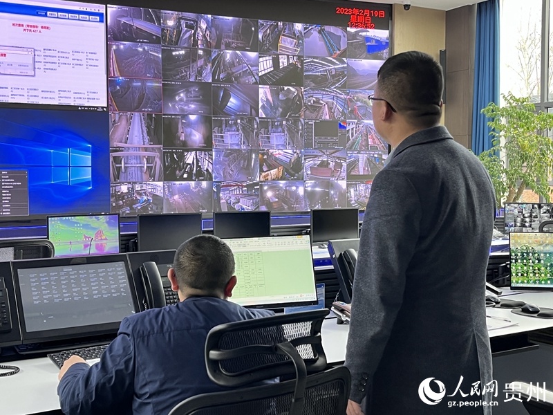 全国人大代表,贵州盘江精煤股份有限公司山脚树矿党委副书记、矿长侯建国正在山脚树矿智能化监控中心调度工作(左二)。人民网 陈洁泉摄