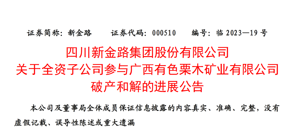 新金路(000510)于3月17日发布公告称,四川新金路集团股份有限公司于 2023 年 2 月 21日,披露了《关于全资子公司参与广西有色栗木矿业有限公司破产和解的进展公告》(公告编号:临 2023—17 号),公司收到广西壮族自治区恭城瑶族自治县人民法院民事裁定书【( 2020)桂 0332 破 1 号之四】,法院认可广西有色栗木矿业有限公司和解协议,认为提交的和解协议,其内容不违反法律、行政法规的强制性规定,且经债权人会议表决一致通过,符合法律规定。依照《中华人民共和国企业破产法》第九十七条、第九十八条、第一百条第一款之规定,裁定: