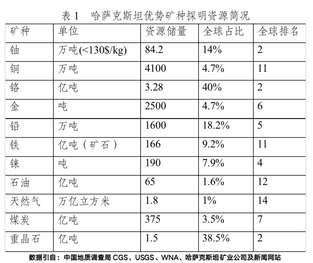 据统计,哈萨克斯坦多种矿产储量位于世界前列(表1),铀和铬铁矿居世界第2位,锰、银和铼世界第4位,铅居第5位,煤居第8位,铝土矿、钛和锡居世界第10位,石油居第11位,天然气居第14位。
