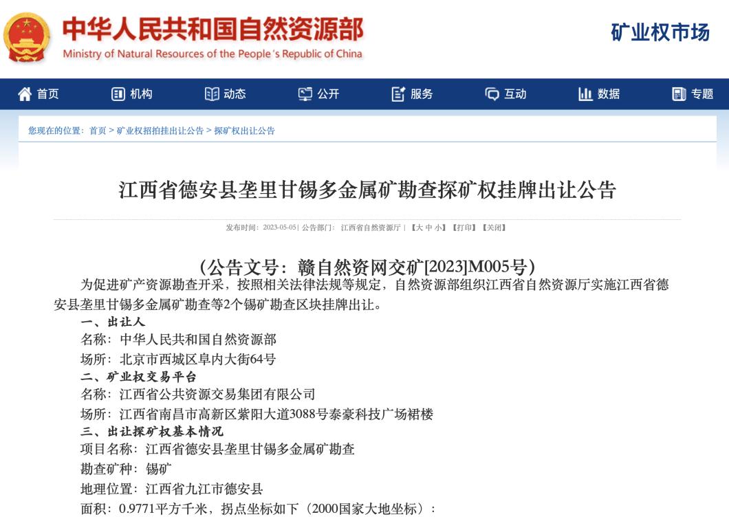 01 江西省德安县垄里甘锡多金属矿勘查探矿权挂牌出让公告
