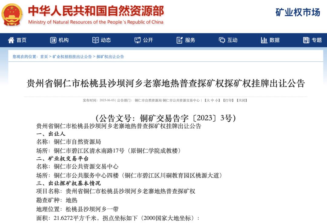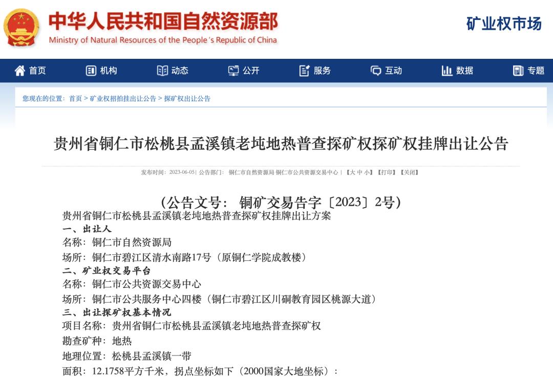 02 贵州省铜仁市松桃县孟溪镇老坉地热普查探矿权探矿权挂牌出让公告