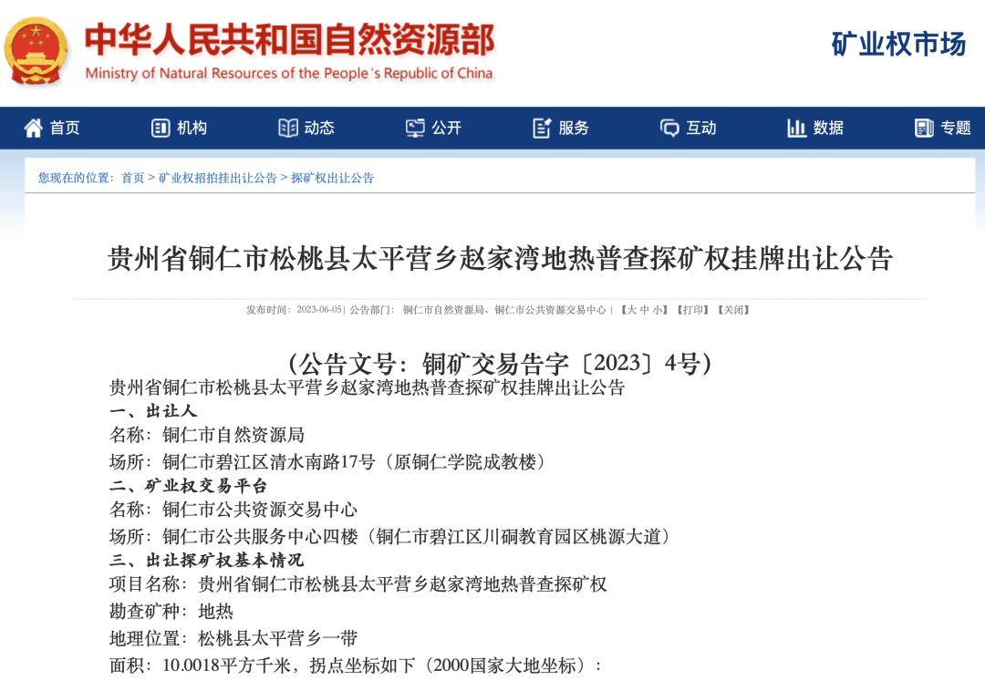 03 贵州省铜仁市松桃县太平营乡赵家湾地热普查探矿权挂牌出让公告