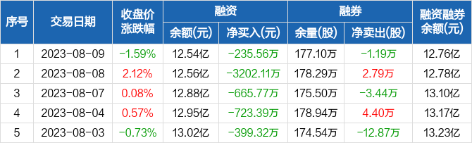 融资方面,当日融资买入1894.3万元,融资偿还2129.86万元,融资净偿还235.56万元,连续5日净偿还累计5226.15万元。融券方面,融券卖出1.35万股,融券偿还2.54万股,融券余量177.1万股,融券余额2185.46万元。融资融券余额合计12.76亿元。
