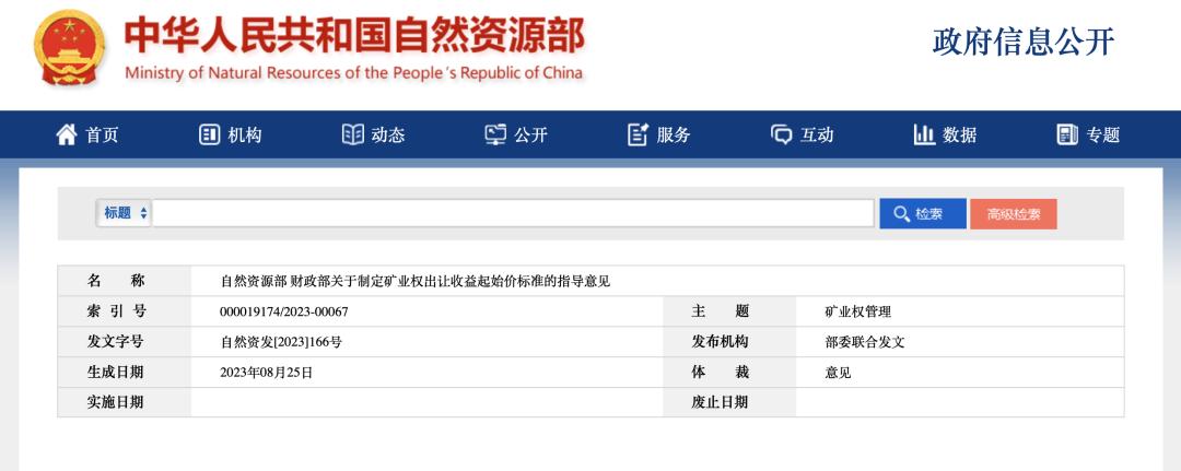 依据《财政部 自然资源部 税务总局关于印发<矿业权出让收益征收办法>的通知》(财综〔2023〕10号)有关规定,现就制定矿业权出让收益起始价标准提出以下指导意见。