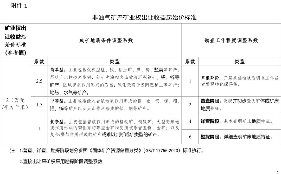一、非油气矿产(不含稀土、放射性矿产)矿业权出让收益起始价标准主要依据矿业权面积,综合考虑成矿条件、勘查程度等因素确定。省级自然资源主管部门、财政部门可结合本地区实际情况,在附件1的基础上,对矿业权出让收益起始价标准(参考值)进行调整,调整幅度不超过10%。具体执行标准报省级人民政府同意后公布实施。标准制定后,原则上不再调整。各地在制定标准时应充分考虑促进探矿权出让市场活跃,降低探矿权取得门槛,不与资源储量挂钩。稀土、放射性矿产矿业权出让收益起始价标准按附件1执行。