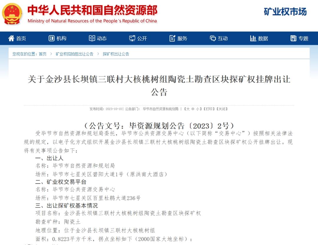 01 关于金沙县长坝镇三联村大核桃树组陶瓷土勘查区块探矿权挂牌出让公告