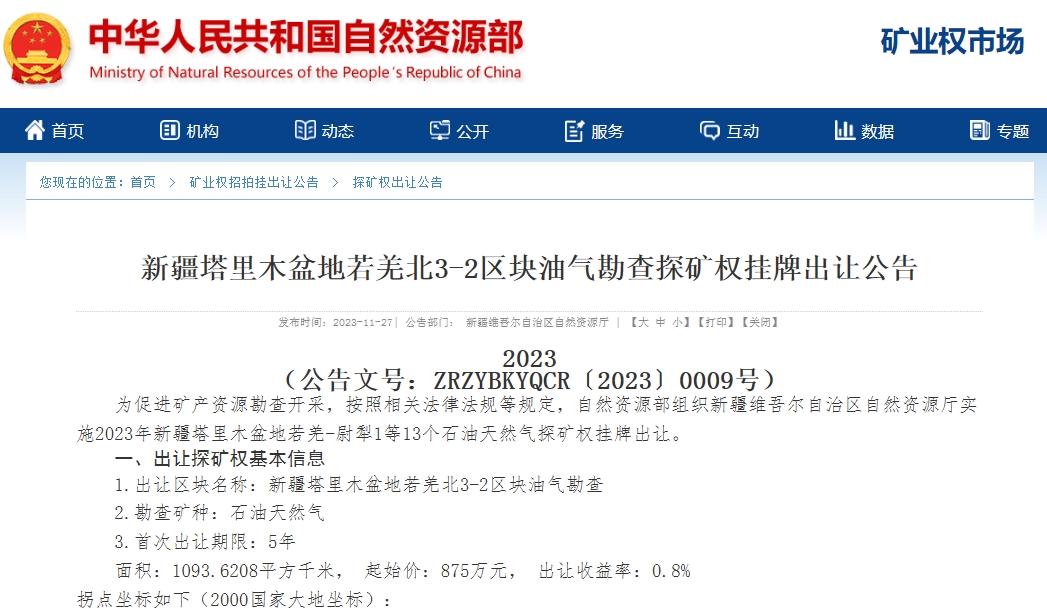 01 新疆塔里木盆地若羌北3-2区块油气勘查探矿权挂牌出让公告