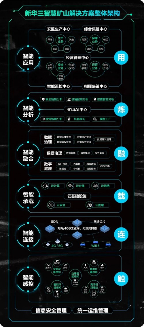 凭借多年服务于煤矿企业的深厚积累,新华三集团聚焦矿山生产智能化、安全智能化、支撑系统智能化变革趋势,联合行业领军企业及生态伙伴,持续完善智能化矿山的整体建设思路和方案,打造出新华三智慧矿山解决方案,从智能感控、智能连接、智能承载、智能融合、智能分析、智能应用、信息安全及统一运维等方面,帮助煤矿企业共建安全、高效、绿色、低碳的安全生产之路。