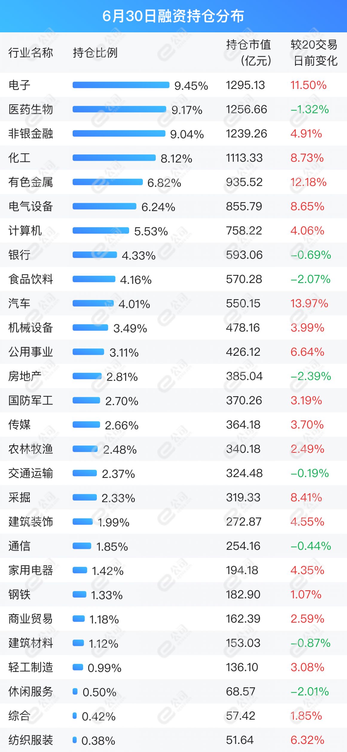 e公司数据统计显示,截至6月30日,融资持仓市值前五行业为电子、医药生物、非银金融、化工、有色金属,占持仓总市值42.6%。