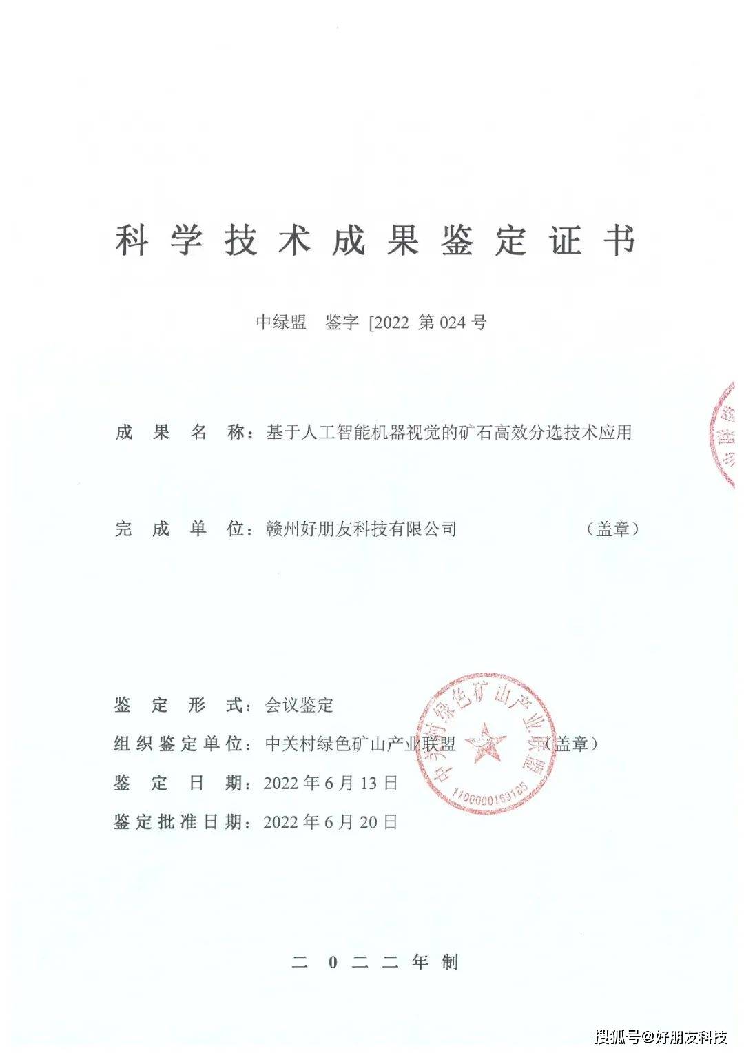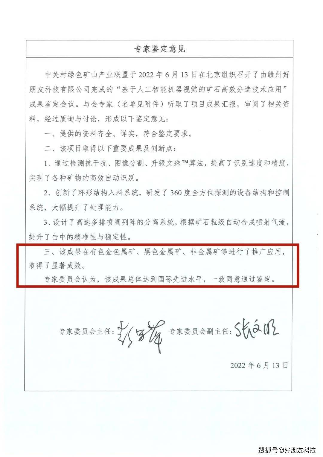 近日,中关村绿色矿山产业联盟在北京组织召开科技成果鉴定会,由好朋友科技自主创新研发的“基于人工智能机器视觉的矿石高效分选技术应用”,凭借卓越的技术创新能力和广泛的应用价值,获得技术鉴定专家委员会专家们的高度肯定,被认定为国际先进水平。