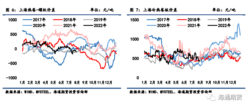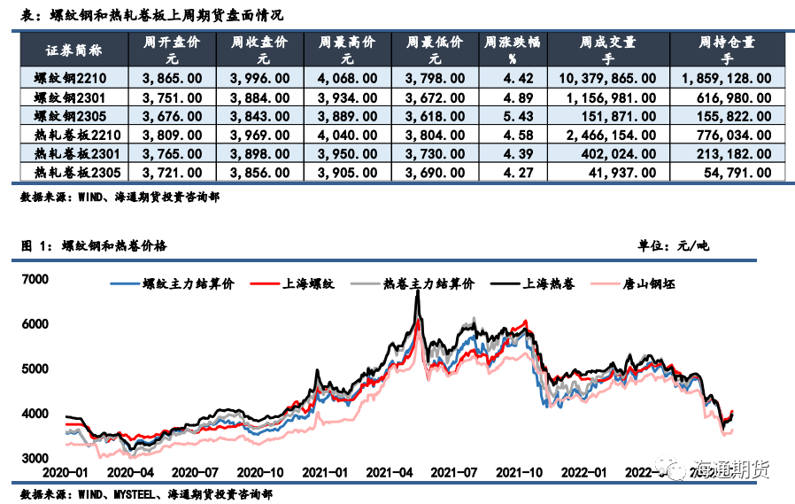 上周钢材期货盘面价格延续反弹,现货价格同样反弹走强。上周螺纹钢 2210 合约上涨 4.42%至 3996 元/吨,热轧卷板 2210 合约上涨 4.58%至 3969 元/吨。螺纹钢(4093, 79.00, 1.97%)近远月价差小幅走弱,热卷(4042, 54.00, 1.35%)近远月价差相对坚挺;螺纹和热卷现货表现略强于期货,基差小幅走强;期货方面热卷主力合约表现略强于螺纹,卷螺价差稍有修复,远月合约卷螺