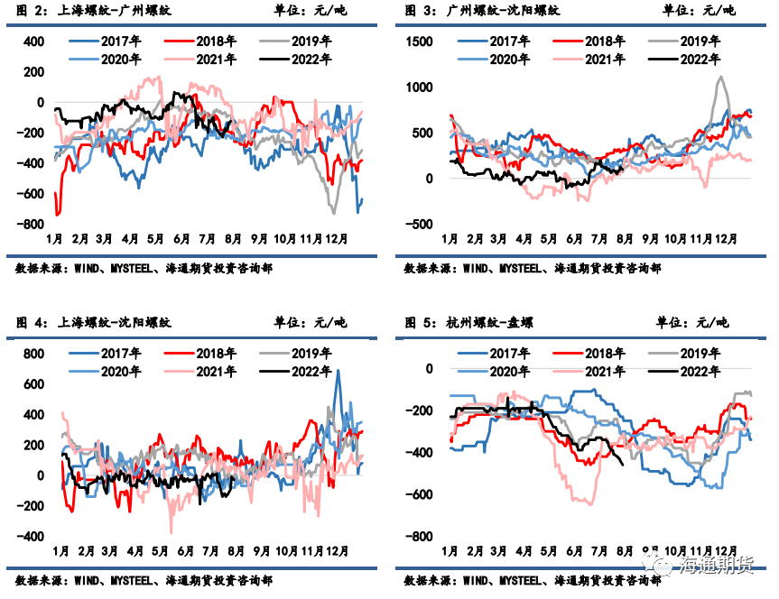 上周钢材期货盘面价格延续反弹,现货价格同样反弹走强。上周螺纹钢 2210 合约上涨 4.42%至3996 元/吨,热轧卷板 2210 合约上涨 4.58%至 3969 元/吨。上周上海螺纹上涨 180 元/吨至 4050 元/吨,杭州螺纹上涨 180 元/吨至 4080 元/吨,广州螺纹上涨 140 元/吨至 4300 元/吨附近,北京螺纹上涨 170 元/吨至 4020 元/吨。螺纹华东华南过磅价差增至-125 元/吨附近,华南北方过磅价差从 47 回升至 94 元/吨附近。上海热卷上涨 150 元/吨至 3950 元/吨,广州热卷上涨 160 元/吨至 3960 元/吨,华东卷螺价差从热卷价格低于螺纹 70 元/吨缩小至 100 元/吨。上周各地区钢坯现货价格表现坚挺,唐山方坯 Q235 上涨 80 元/吨至 3630 元/吨,唐山 20MnSi上涨 80 元/吨至 3730 元/吨,江苏 20MnSi 上涨 110 元/吨至 3950 元/吨,江苏和唐山间价差升至 220元/吨。