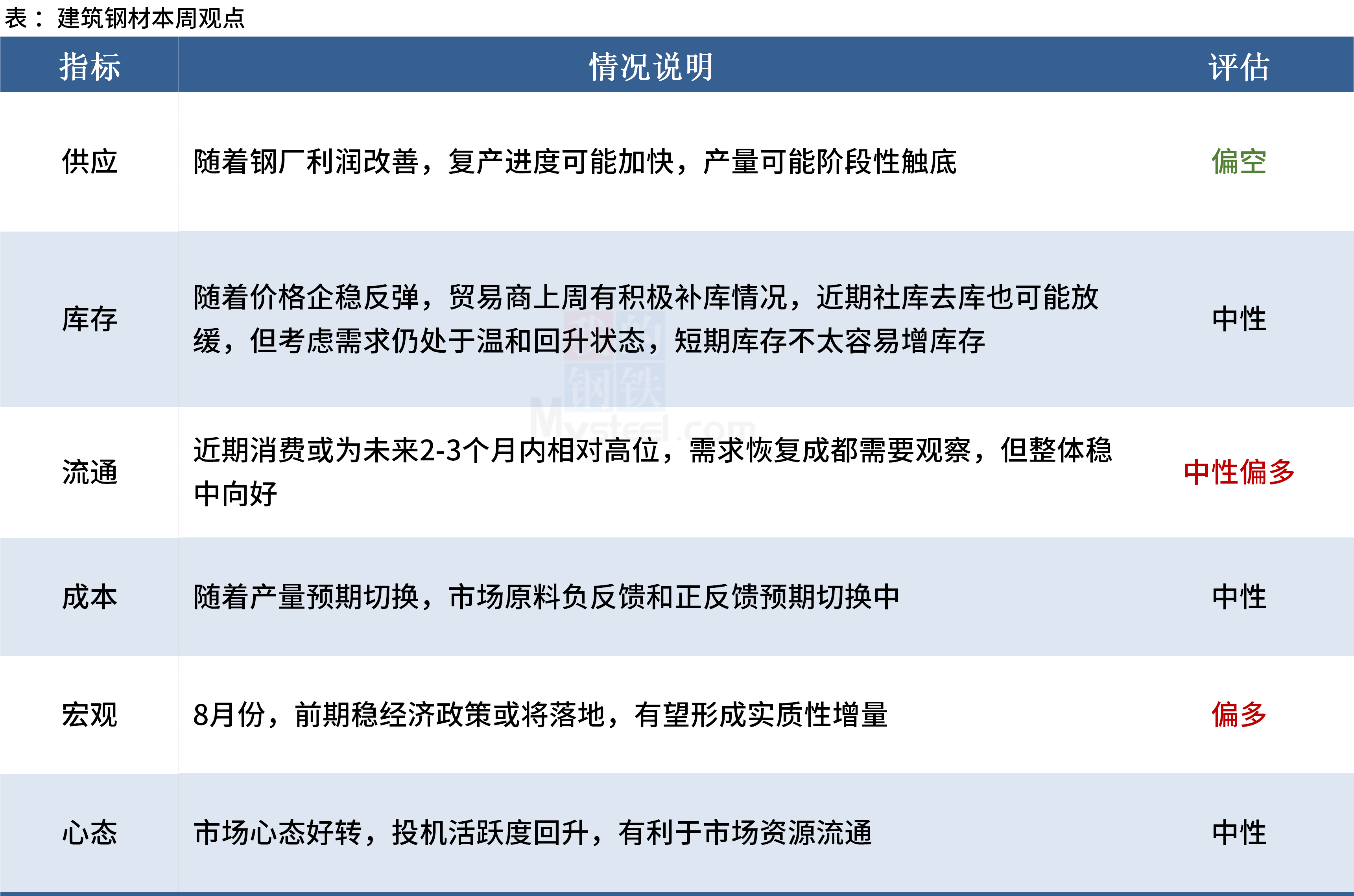 目前供应已经达到了短期的低点,制造业消费需求在缓慢改善。从平衡看,钢厂再度减量空间有限,成本弱支撑问题出现,本周市价预期在3950-4150元/吨之间运行。目前海外的利空因素减少,而现实端的实际“核心矛盾”改变的并不明显,估值修复后,仍需等待新的驱动出现,呈现趋势不变,短期节奏调节的过程。