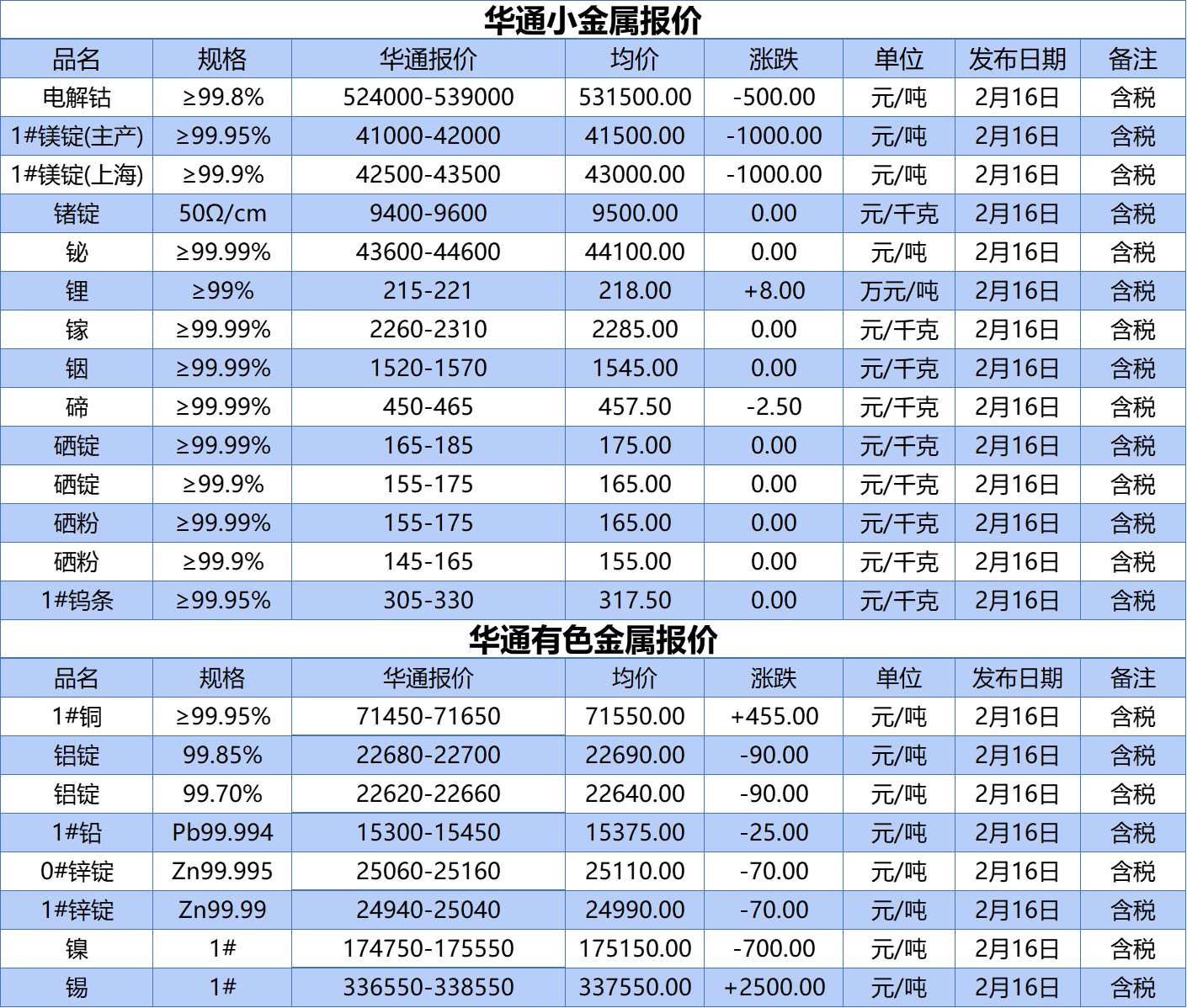 上海华通报价2月16日讯:电解钴、1#镁锭(生产)、1#镁锭(上海)、锗锭、铋、锂、镓、铟、碲、硒锭(99.99%)、硒锭(99.9%)、硒粉、硒粉(99.9%)、1#钨条报价
