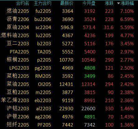 金融界2月22日消息 国内期货市场收盘,商品期货多数收涨,燃油涨超7%,沥青涨超6%,原油涨逾5%,LU涨超4%,豆二、PTA涨超3%,菜油、LPG等涨超涨超2%,沪铝、纯碱等涨超1%,玉米、焦炭等小幅上涨;NR、生猪等跌超2%,硅铁、热卷等跌超1%,PVC、铁矿石等小幅下跌。