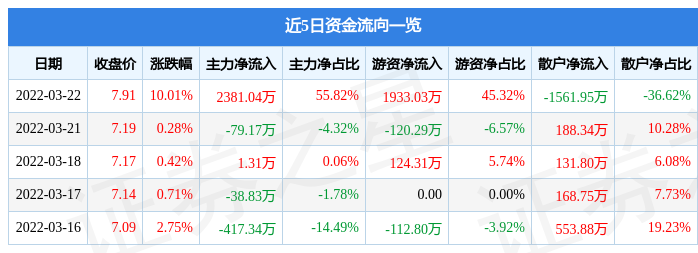 资金流向数据方面,当日主力资金净流入2381.04万元,游资资金净流入1933.03万元,散户资金净流出1561.95万元。近5日资金流向一览见下表: