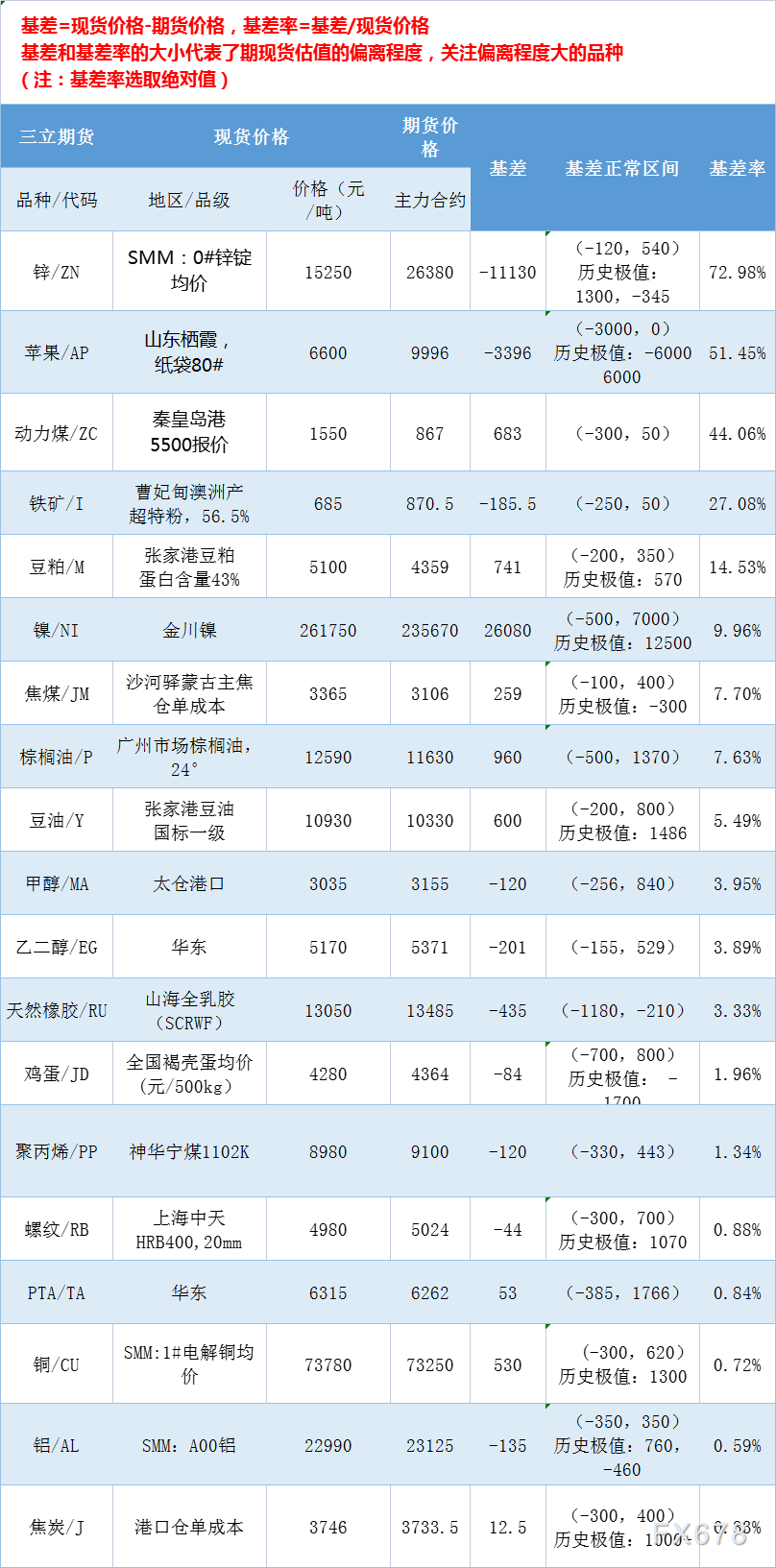 三立期货基差:一张图尽览3月28日有色金属、黑色系、能源化工和农产品基差(按基差率从大到小排序)。