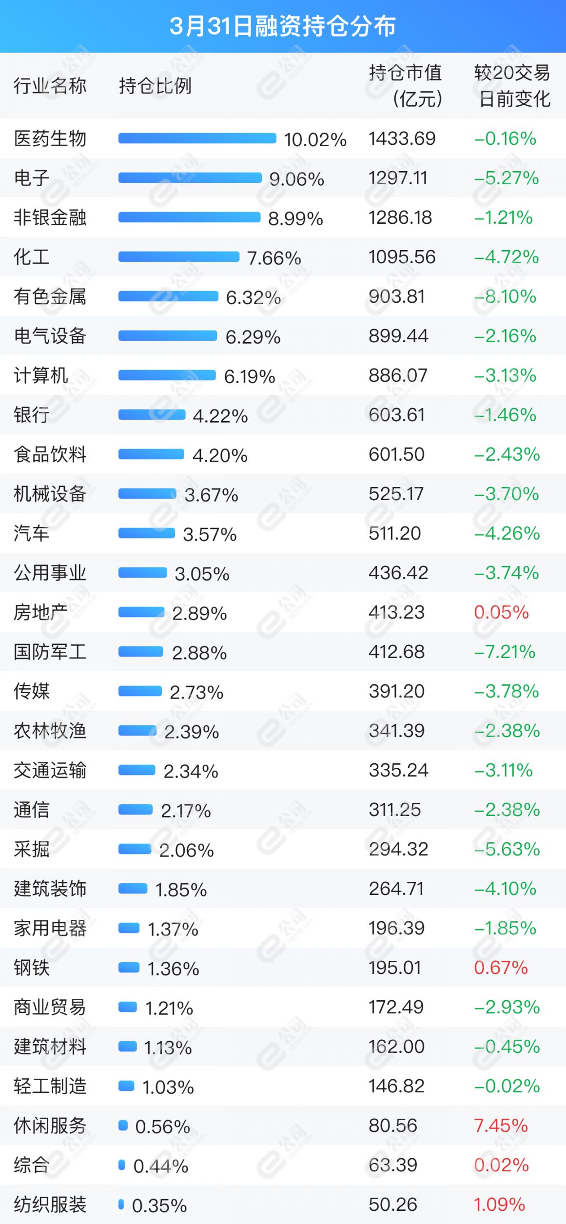 e公司数据统计显示,截至3月31日,融资持仓市值前五行业为医药生物、电子、非银金融、化工、有色金属,占持仓总市值42.04%。