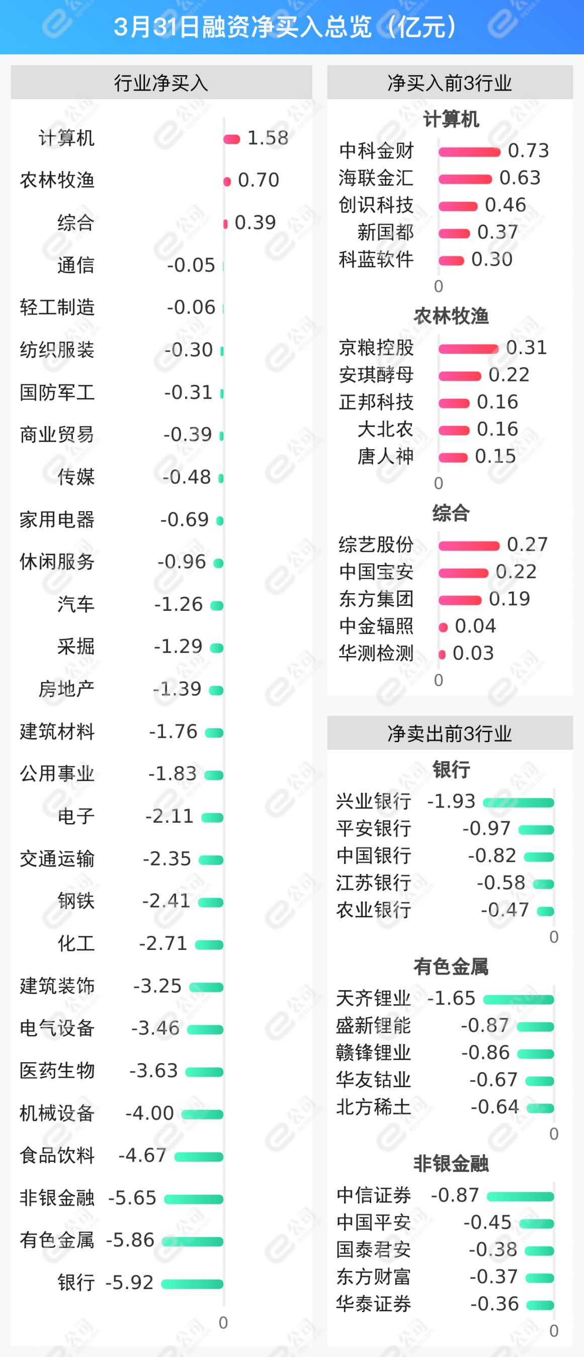 计算机、农林牧渔、综合获融资净买入金额居前,分别为1.58亿元、0.7亿元、0.39亿元。