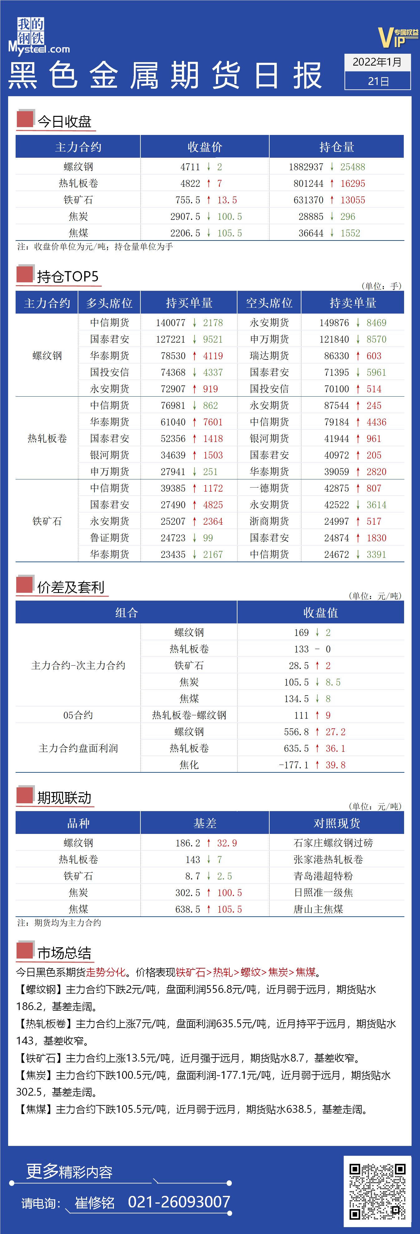 今日黑色系期货走势分化。价格表现铁矿(767, 10.50, 1.39%)石>热轧>螺纹>焦炭(2963, 35.50, 1.21%)>焦煤(2211, -16.50, -0.74%)。【螺纹钢(4722, 10.00, 0.21%)】主力合约下跌2元/吨,盘面利润556.8元/吨,近月弱于远月,期货贴水186.2,基差走阔。【热轧板卷】主力合约上涨7元/吨,盘面利润635.5元/吨,近月持平于远月,期货贴水143,基差收窄。【铁矿石】主力合约上涨13.5元/吨,近月强于远月,期货贴水8.7,基差收窄。【焦炭】主力合约下跌100.5元/吨,盘面利润-177.1元/吨,近月弱于远月,期货贴水302.5,基差走阔。【焦煤】主力合约下跌105.5元/吨,近月弱于远月,期货贴水638.5,基差走阔。