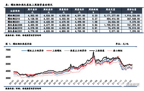 上周成品材期货盘面价格呈连续反弹态势,现货价格涨跌互现。上周 螺纹钢 2201 合约上涨 1.58%至 4620 元/吨,热轧卷板 2201 合约上涨 1.92%至 4820 元/吨。 螺纹和热卷 1-5 近远月价差走弱,螺纹 5-10 月价差基本维稳,热卷 5-10 月价差小幅走扩; 卷螺现货弱于期货, 基差走弱; 期货方面热卷表现强于螺纹,卷螺价差扩大; 铁矿强于