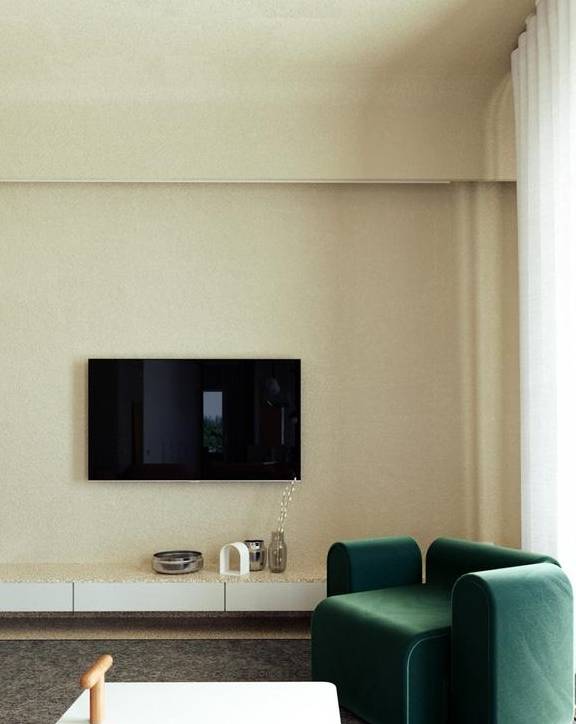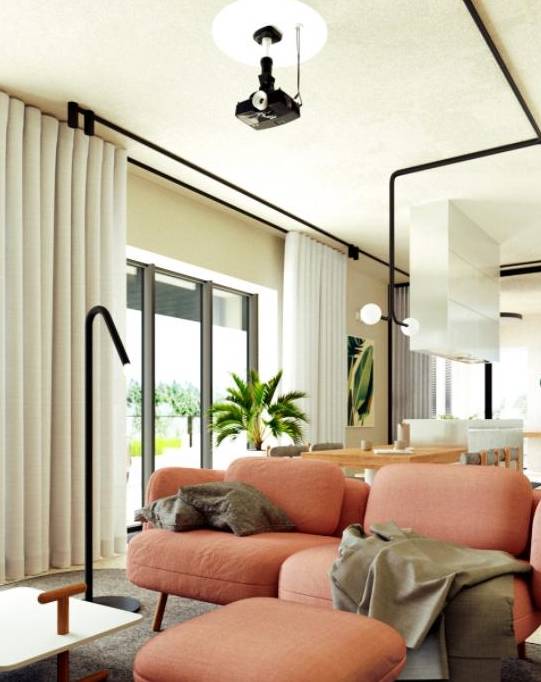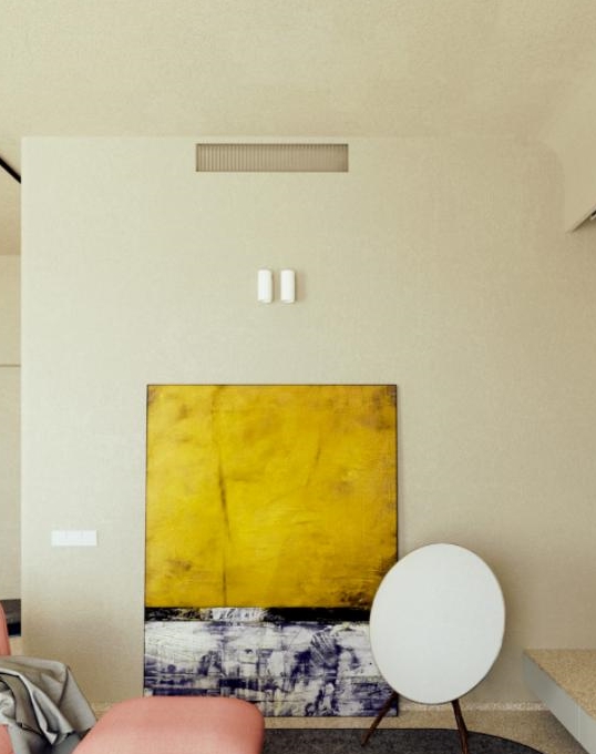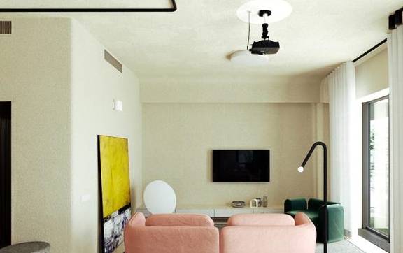 客厅的色彩非常大胆,不同颜色使得整个空间充满欢快气息,墙面、地面和窗帘则保持浅色,再用黑色金属材质进行中和。