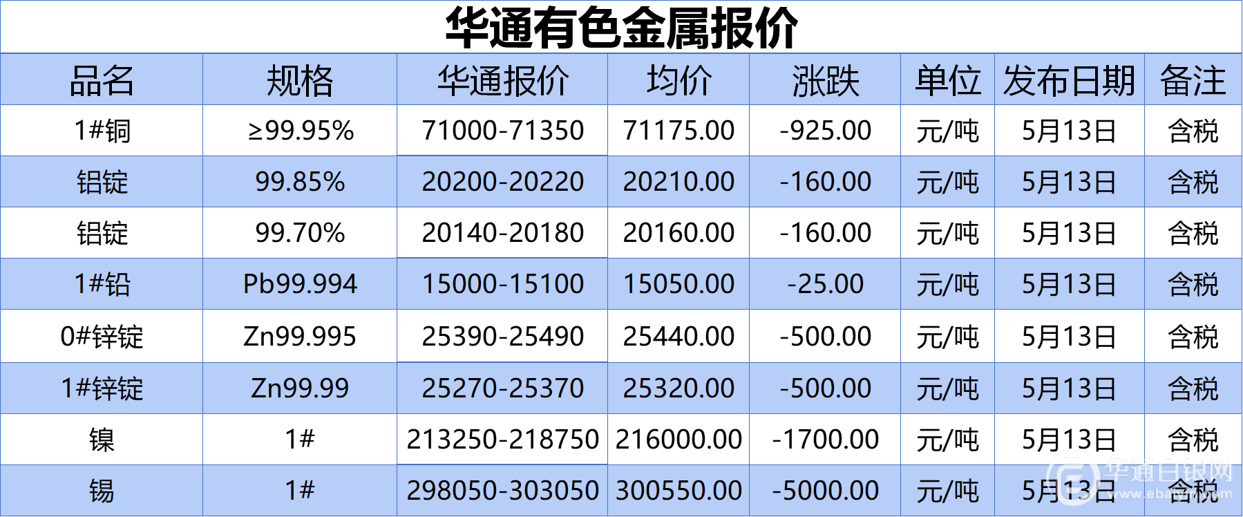 华通白银网5月13日讯:1#铜、铝锭(99.85%)、铝锭(99.70%)、1#铅、1#锌、0#锌、镍、锡报价