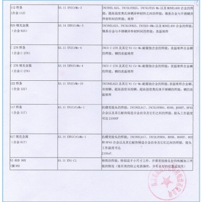 用途:具有广泛的应用范围,可以用于异种材料的焊接,如:INCONEL系列合金、INCOLOY系列合金与碳钢、不锈钢、镍以及MONEL系列合金的焊接;MONEL系列合金与碳钢的焊接;镍与不锈钢的焊接;不锈钢与碳钢的焊接