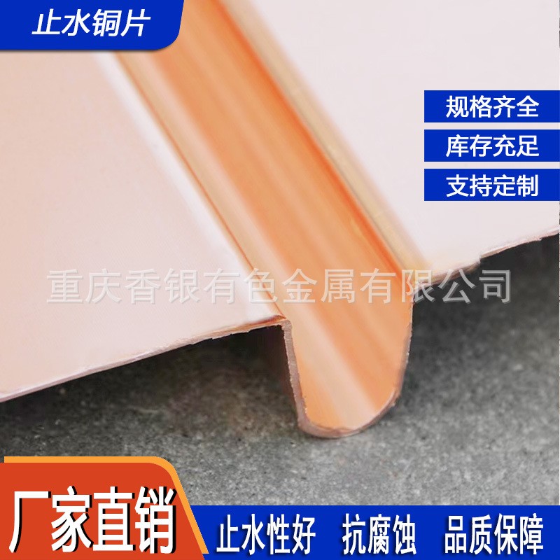重庆香银公司铜板止水可根据大样图免费加工成型,目前常用铜板止水含W型(带立腿,增加与混凝土的咬合程度,可有效防止绕渗)、F型(效果同W型铜板止水)、圆弧型(主要用于隧道止水)等。我公司提供国标止水铜板的质检报告以及质量保证书,同时可按协议标准加工生产。